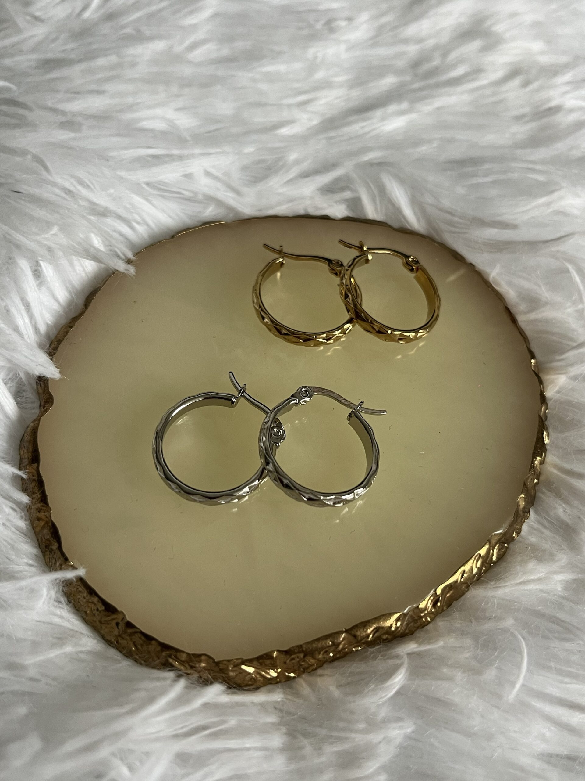 Ατσάλινοι κρίκοι με ιδιαίτερο σχέδιο. Μπορούν να φορεθούν από το πρωί μέχρι το βράδυ. Μέγεθος: 2 εκατοστά.