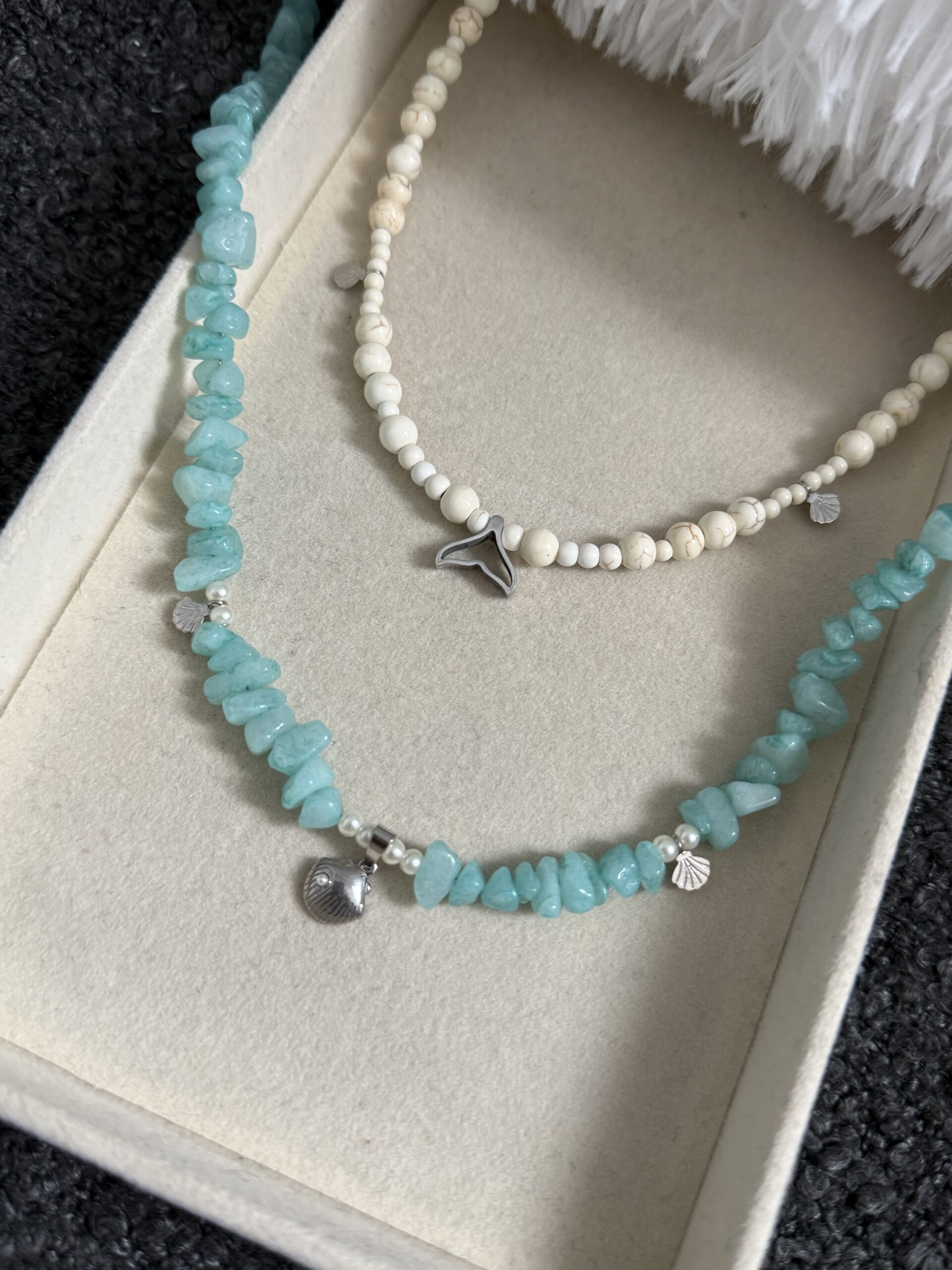 Ατσάλινο 100% χειροποίητα κολιέ με χάντρες λευκού χαολίτη και γαλάζιου νεφρίτη. Τα κρεμαστά είναι ατσάλινα.