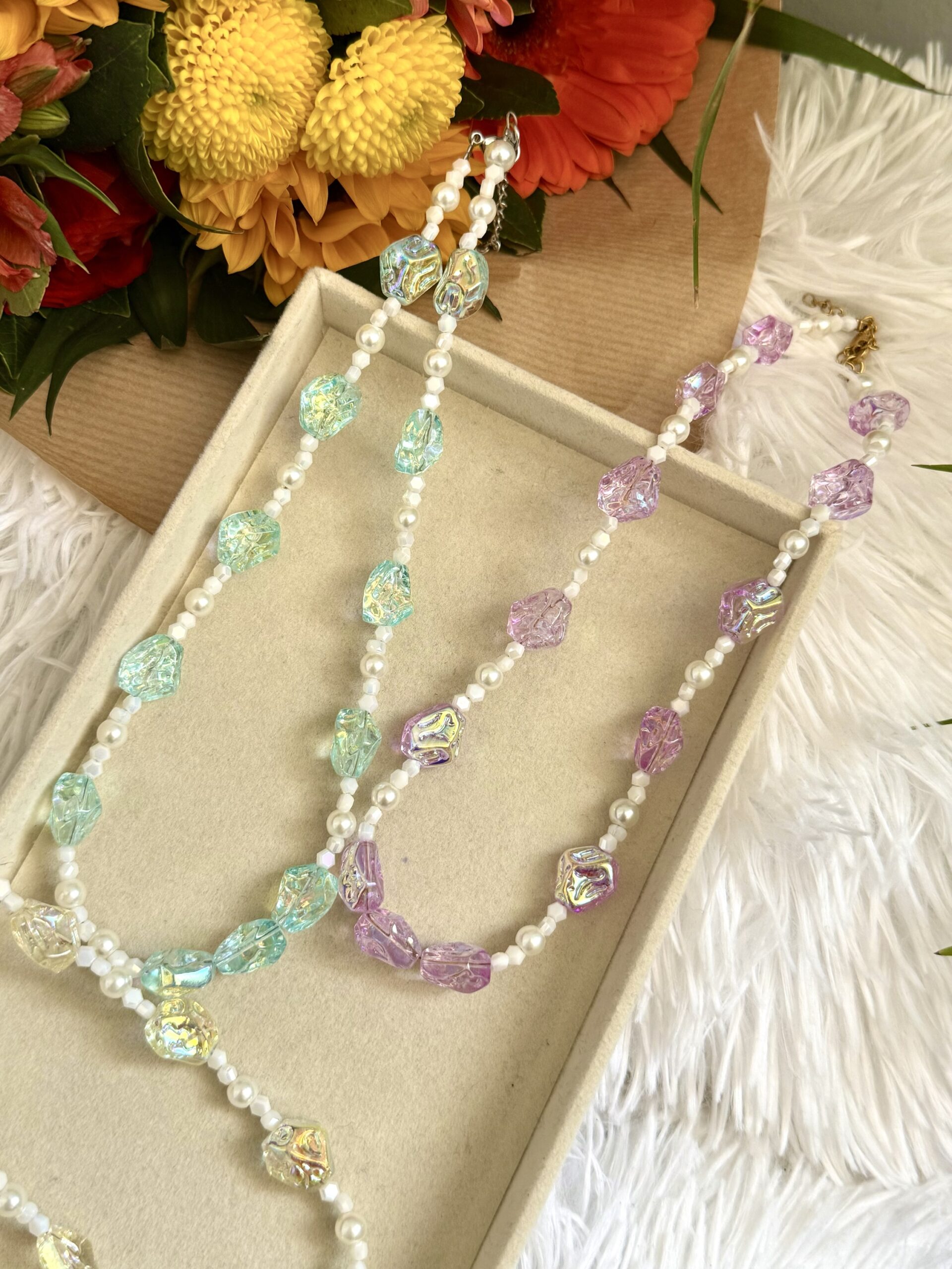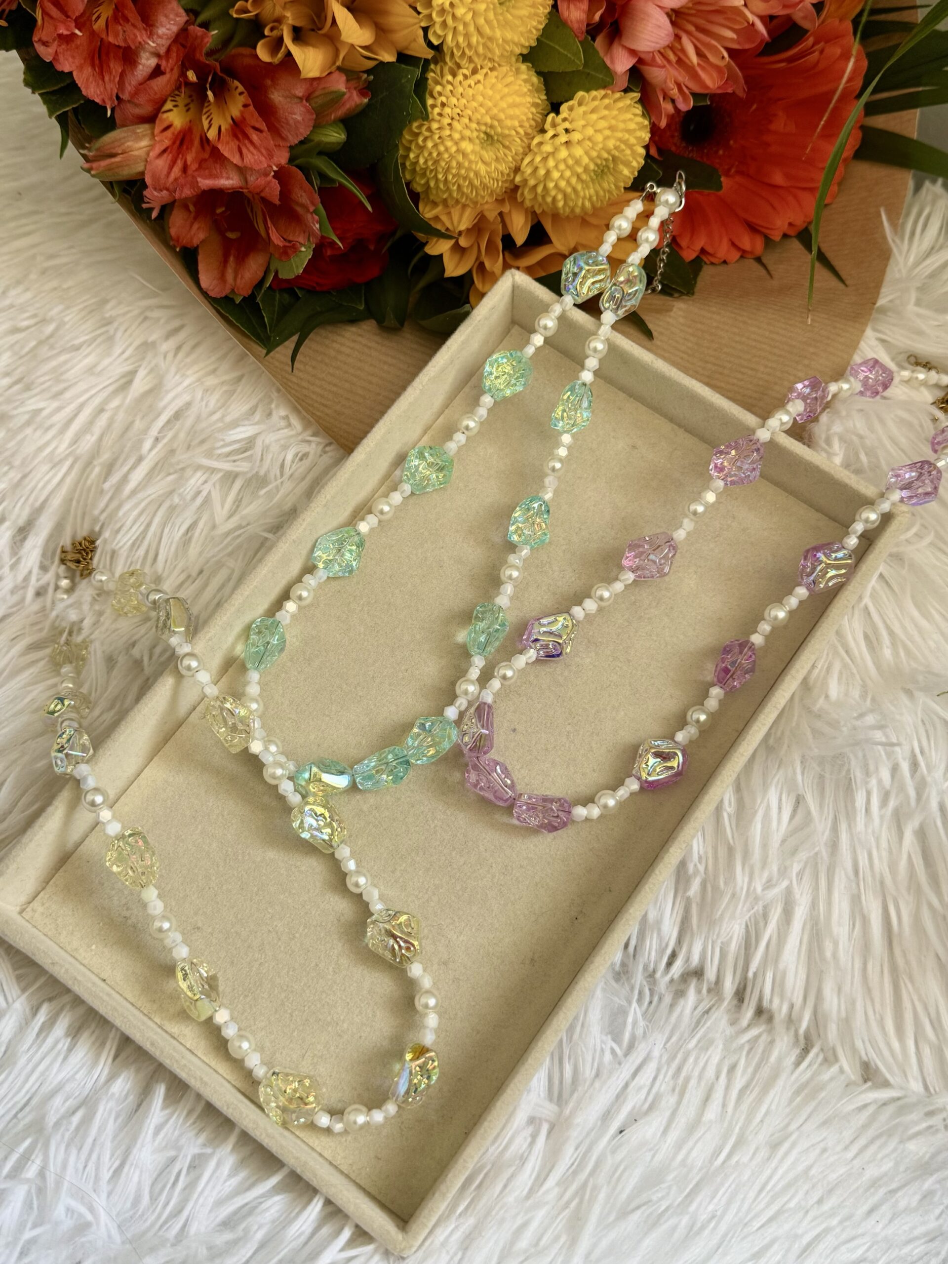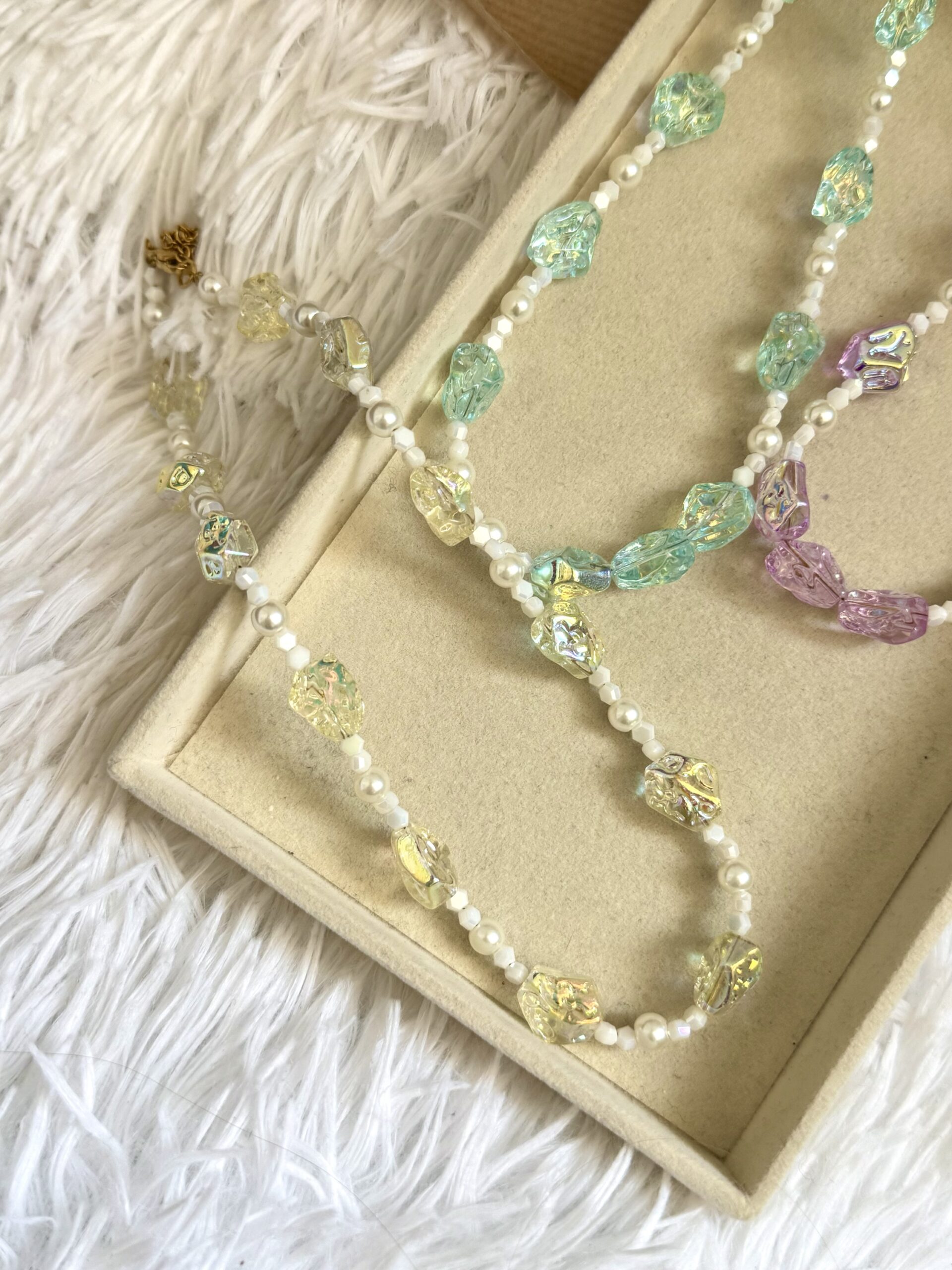 Ατσάλινο 100% χειροποίητο κολιέ με κίτρινες/μπλε/μωβ και λευκές χάντρες. Μέγεθος: 42 εκατοστά με 5 εκατοστά επιμήκυνση.