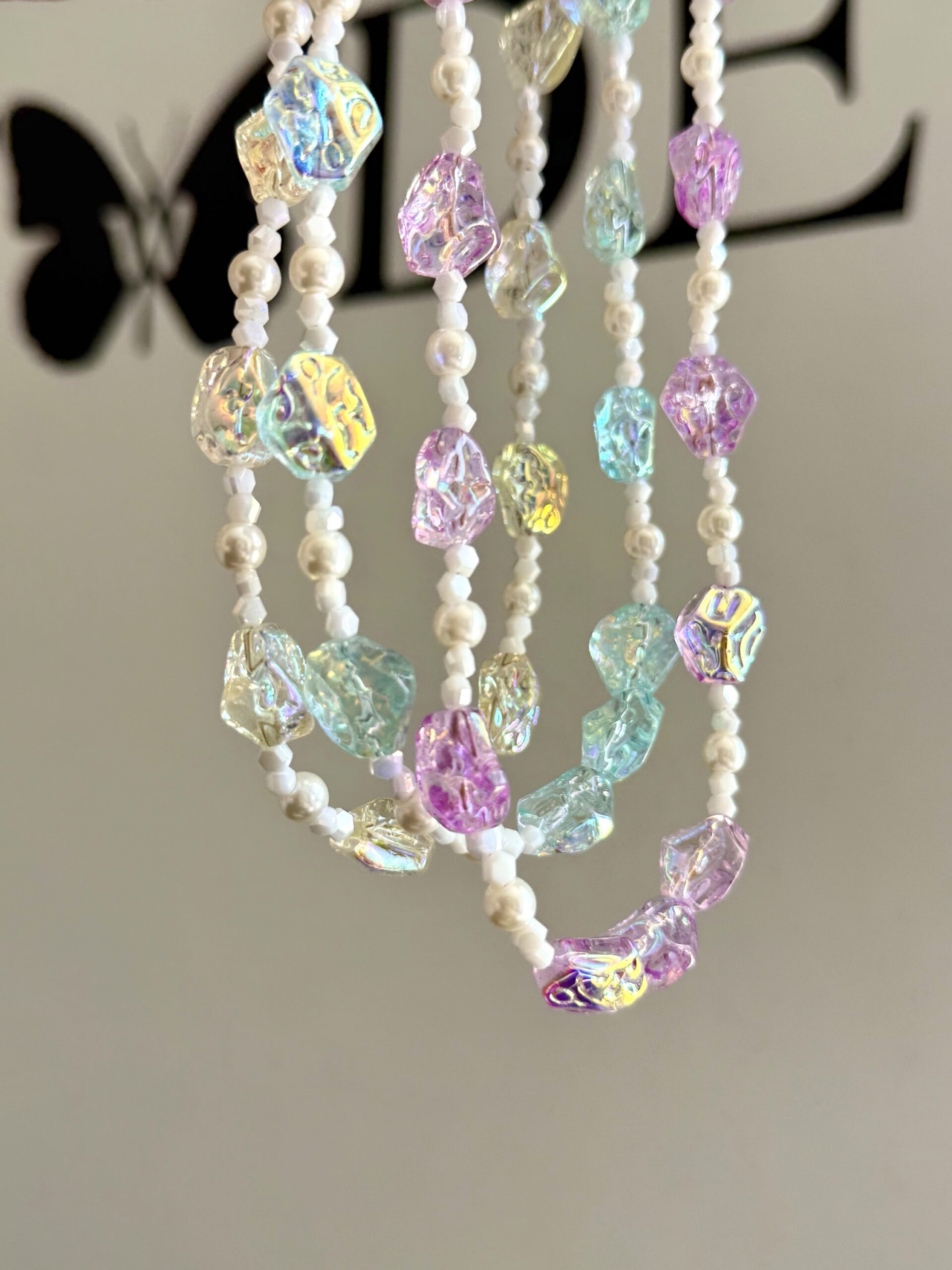 Ατσάλινο 100% χειροποίητο κολιέ με κίτρινες/μπλε/μωβ και λευκές χάντρες.