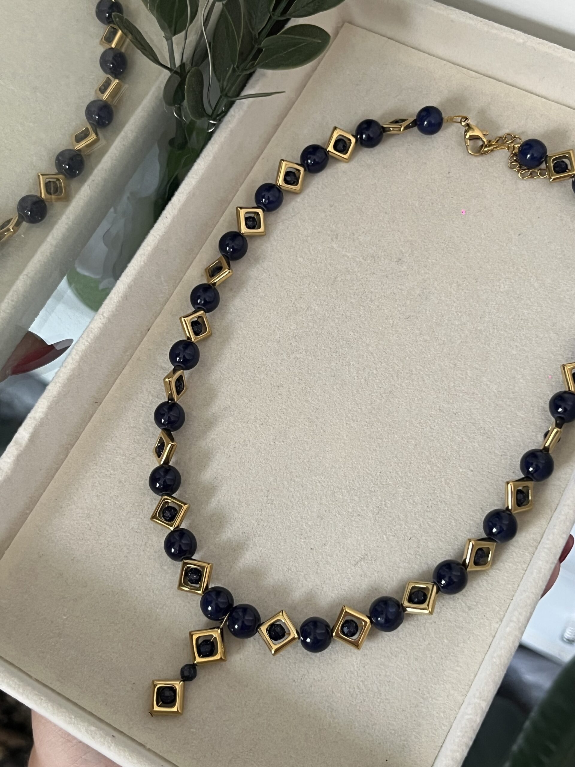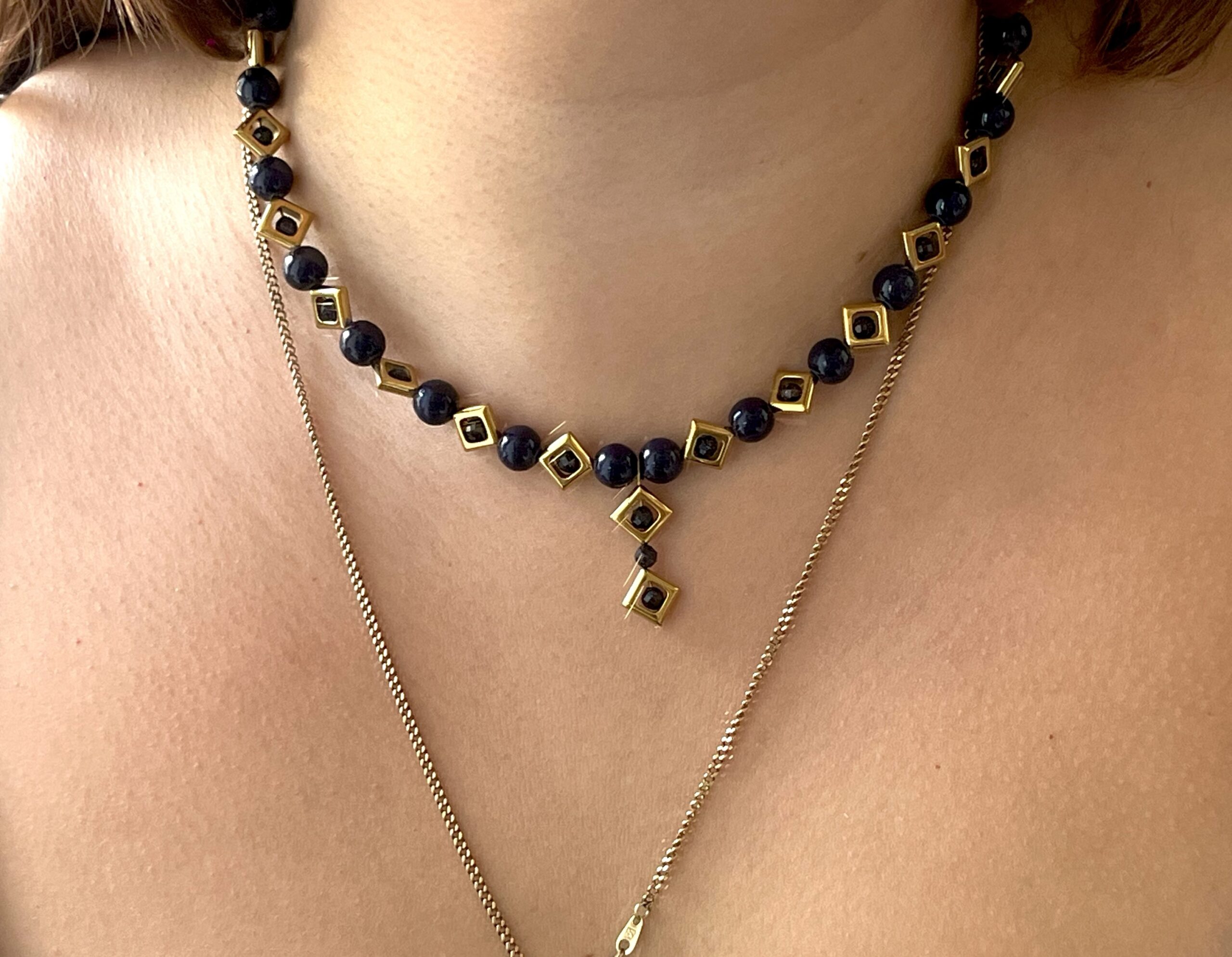 Ατσάλινο 100% χειροποίητο κολιέ με χάντρες μπλε χρυσολιθου και μπλε νεφρίτη. Μέγεθος: 40 εκατοστά με 5 εκατοστά επιμήκυνση.
