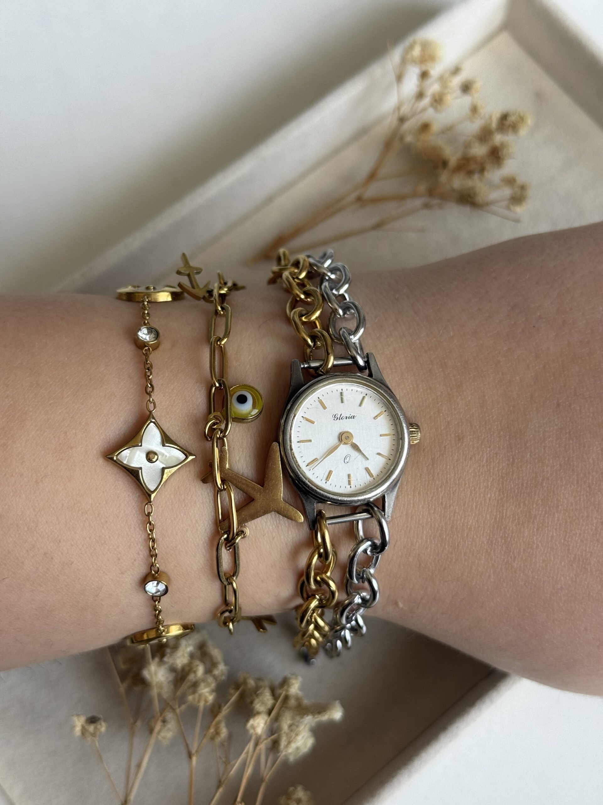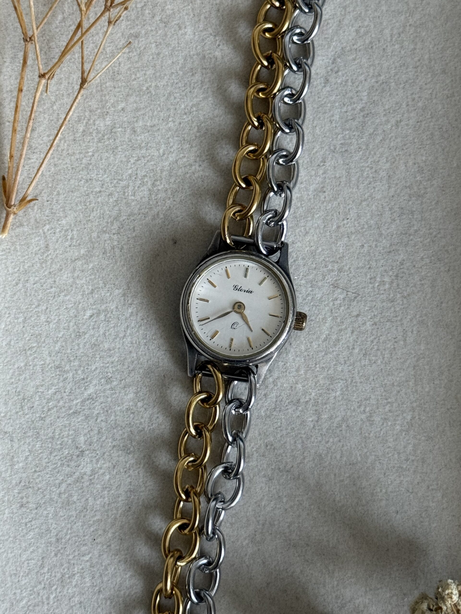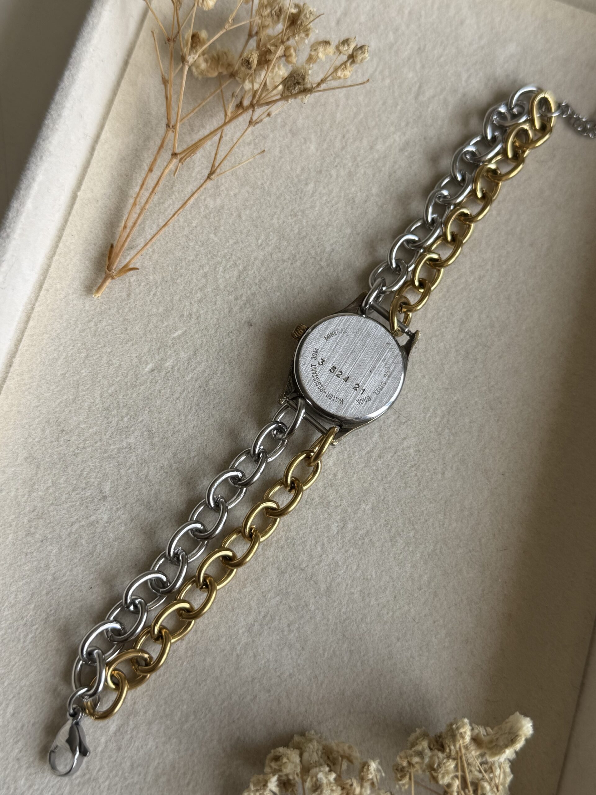 100% χειροποίητο ρολόι/κοσμημα. Φτιαγμένο από άλλο παλιό ρολόι. Ολα τα εξαρτήματα είναι ατσάλινα. Δεν λειτουργεί. Για να λειτουργήσει χρειάζεται αλλαγή μπαταρίας ή επισκευή μηχανισμού.