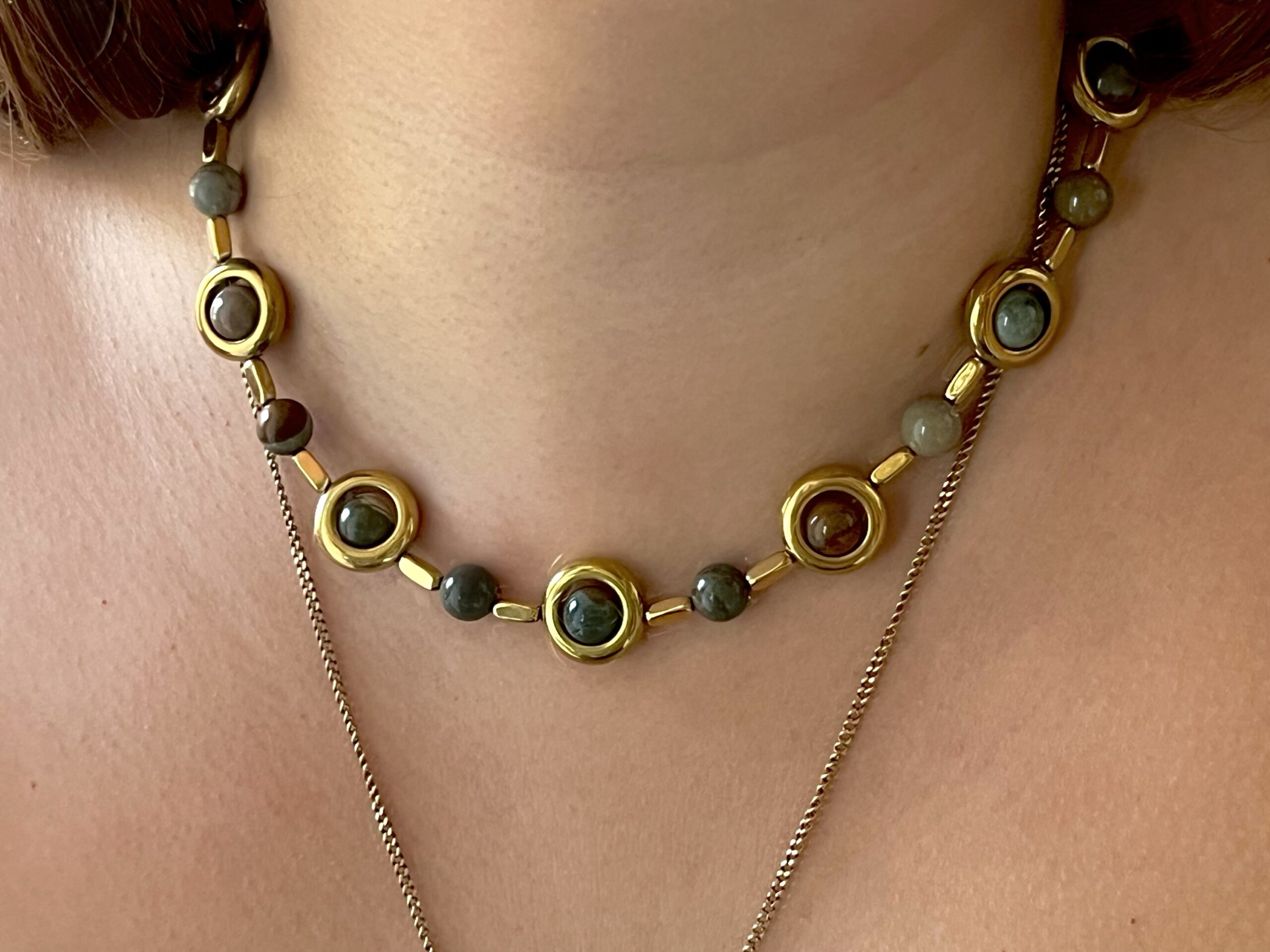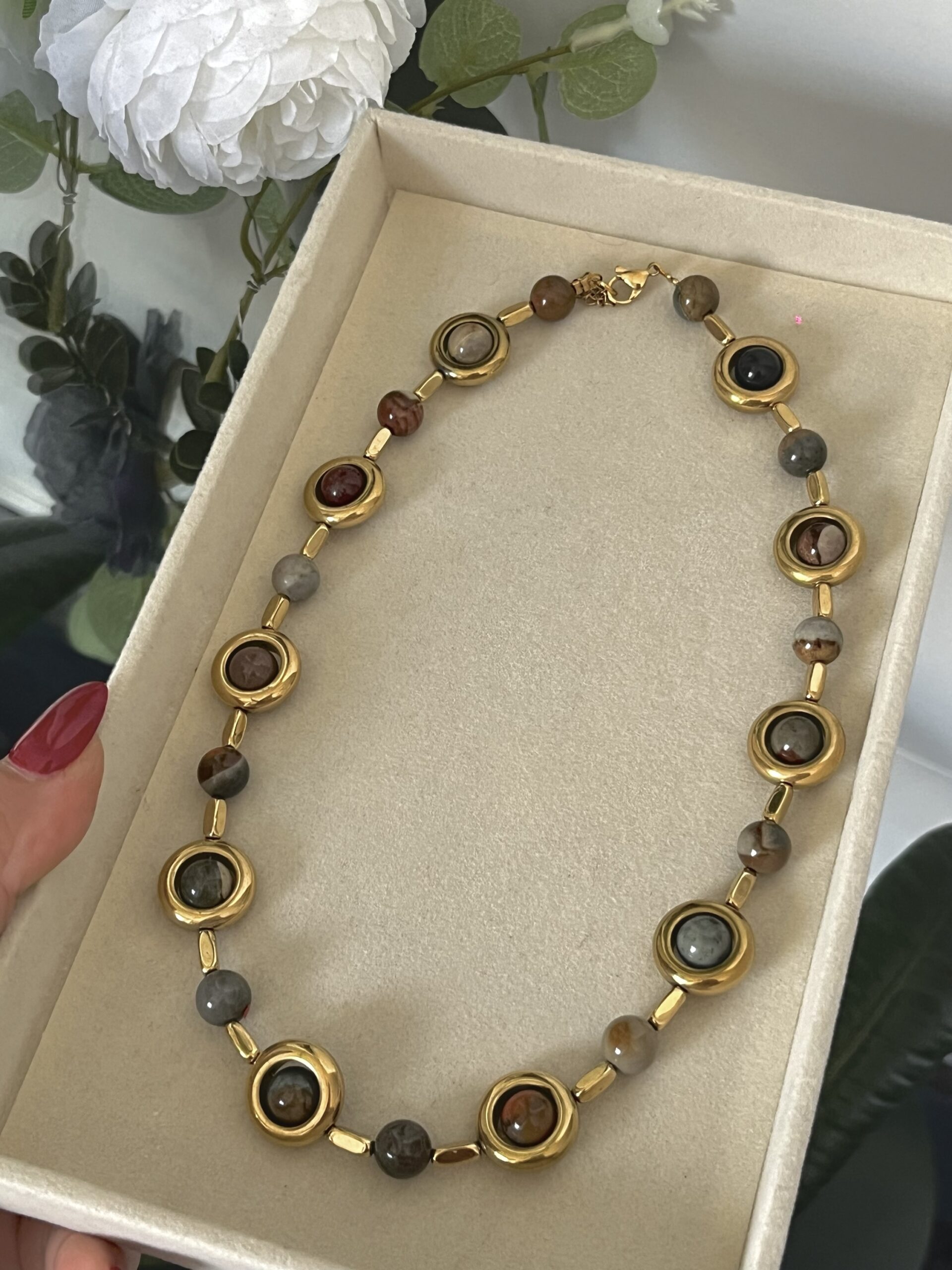 Ατσάλινο 100% χειροποίητο κολιέ με χάντρες αιματίτη και καφέ χάντρες.