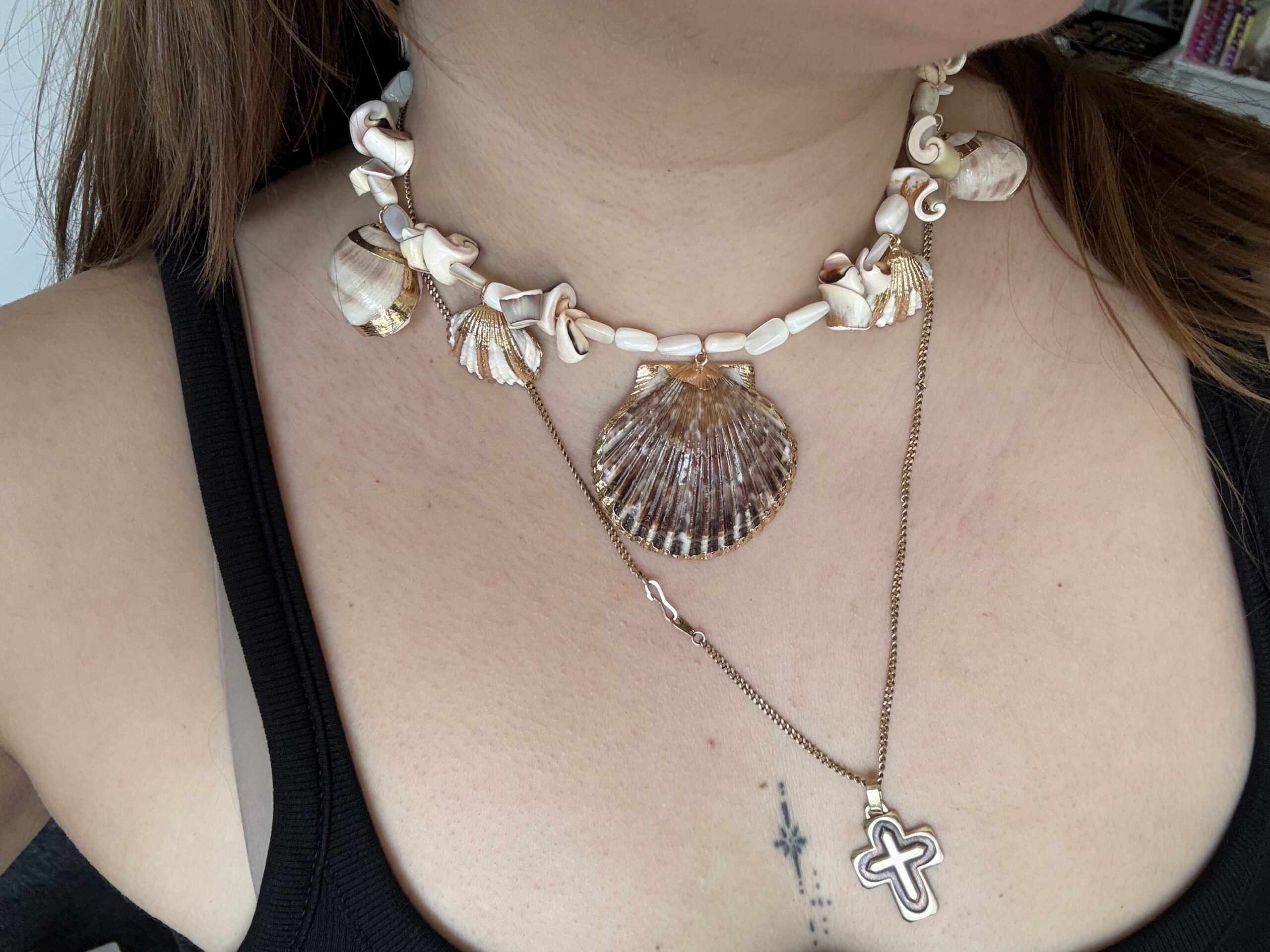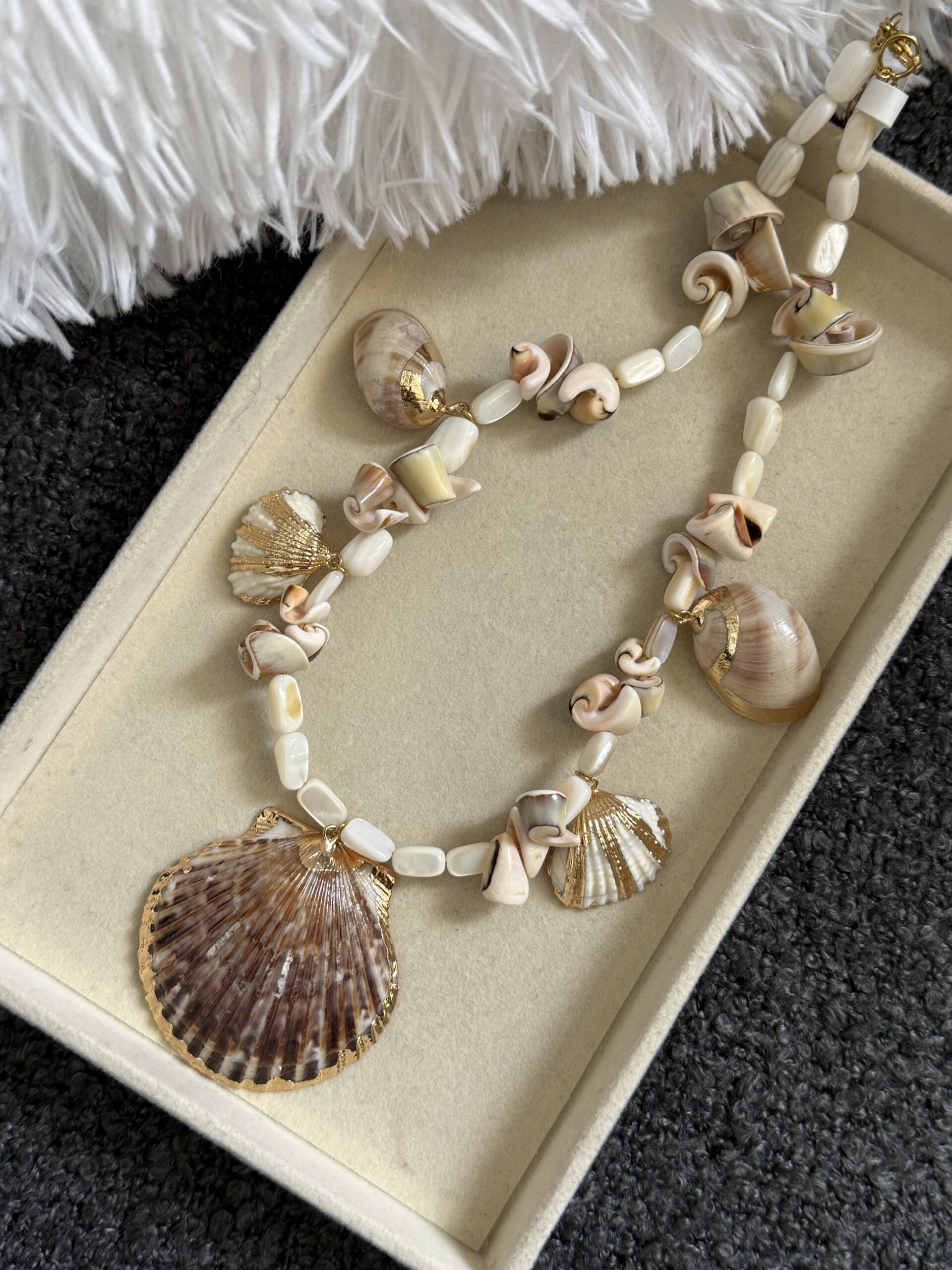 Ατσάλινο 100% χειροποίητο κολιέ με χάντρες φίλντισι και κρεμαστά κοχύλια από ορείχαλκο.