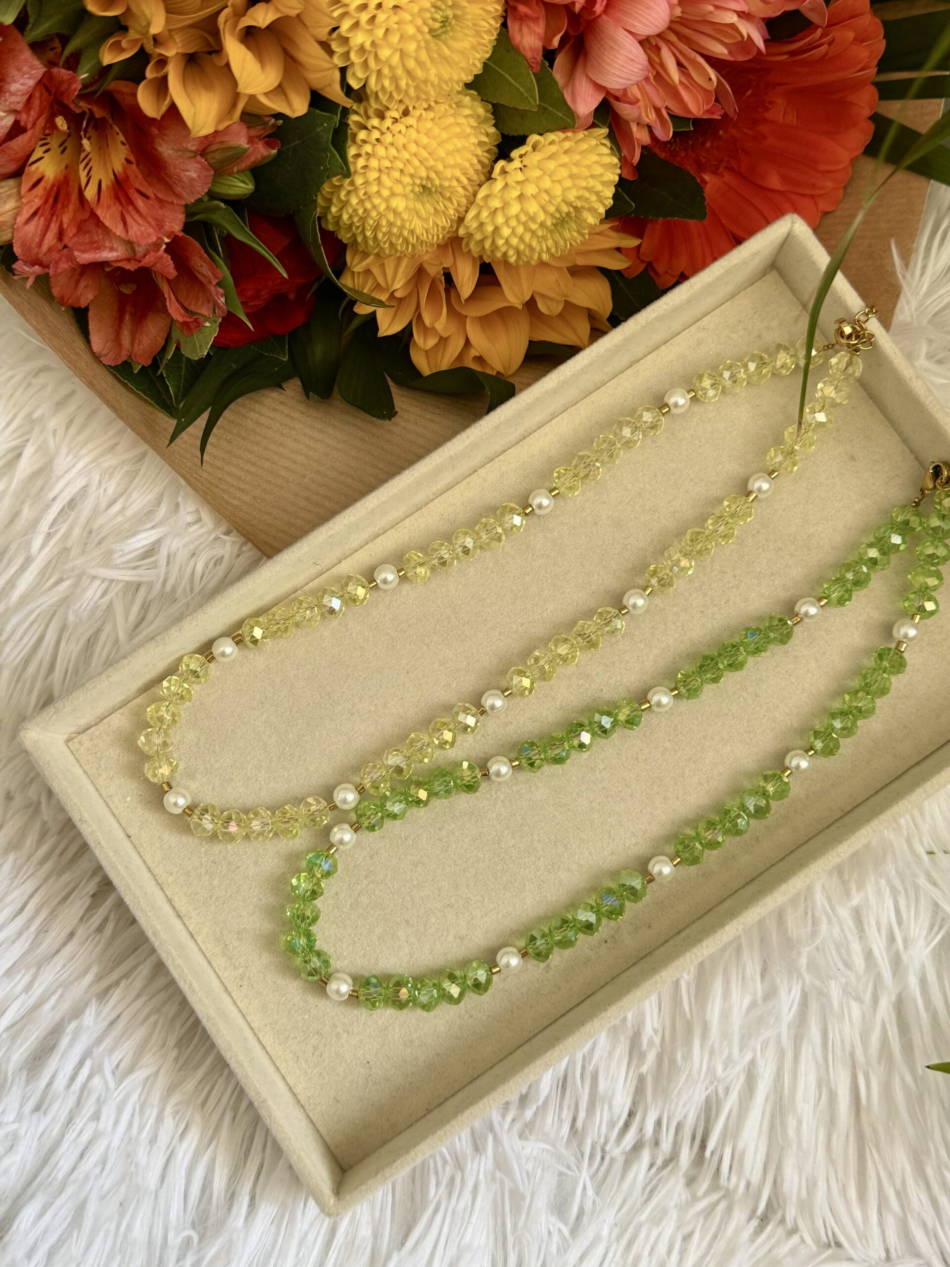 Ατσάλινο 100% χειροποίητο κολιέ με πράσινες/κίτρινες, χρυσές χάντρες και ακρυλικές πέρλες. Μέγεθος: 40 εκατοστά με 5 εκατοστά επιμήκυνση.