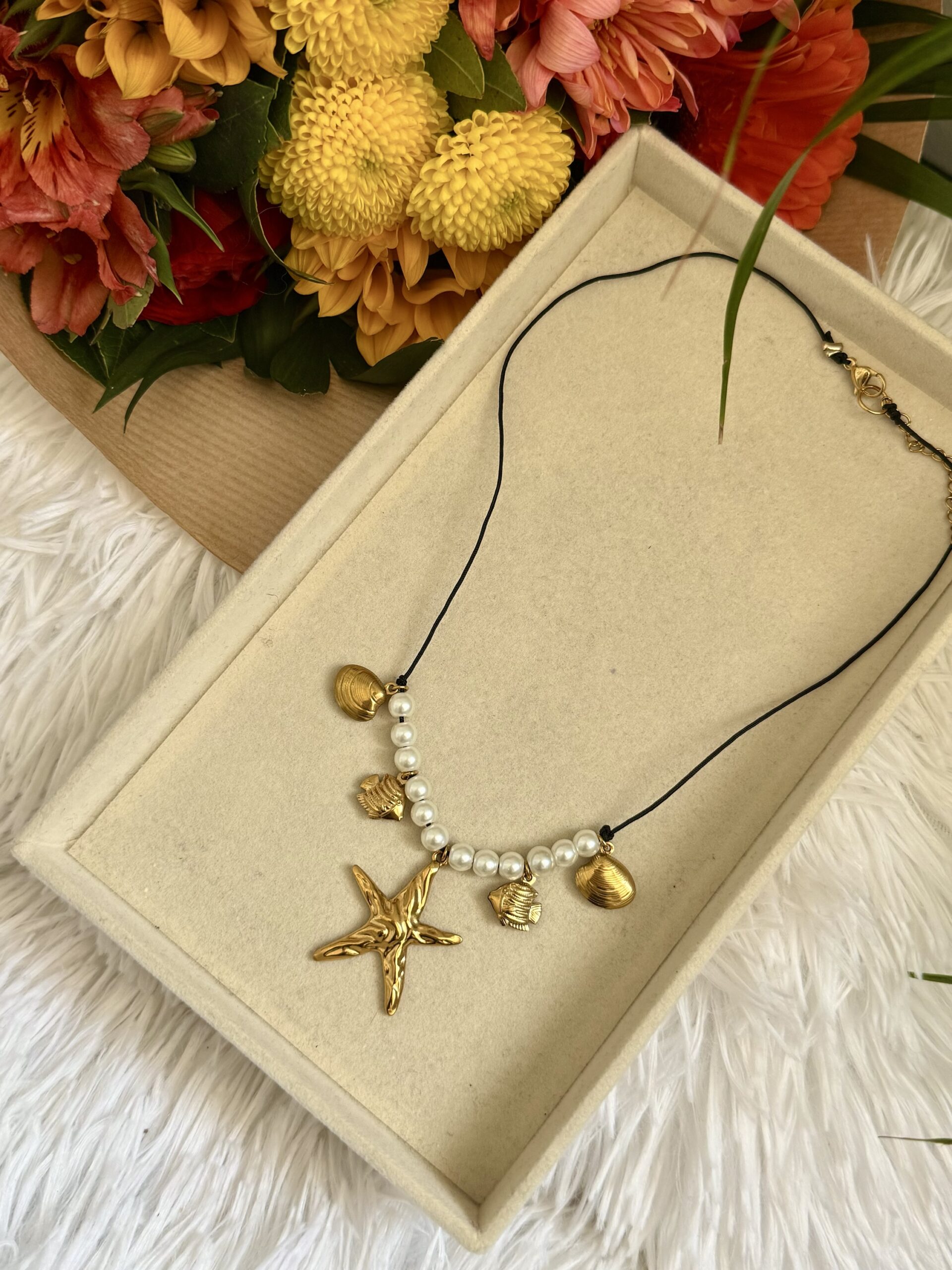 Ατσάλινο 100% χειροποίητο κολιέ με ακρυλικές πέρλες, ατσάλινα κρεμαστά και σκοινί.. Μέγεθος: 45 εκατοστά με 5 εκατοστά επιμήκυνση.