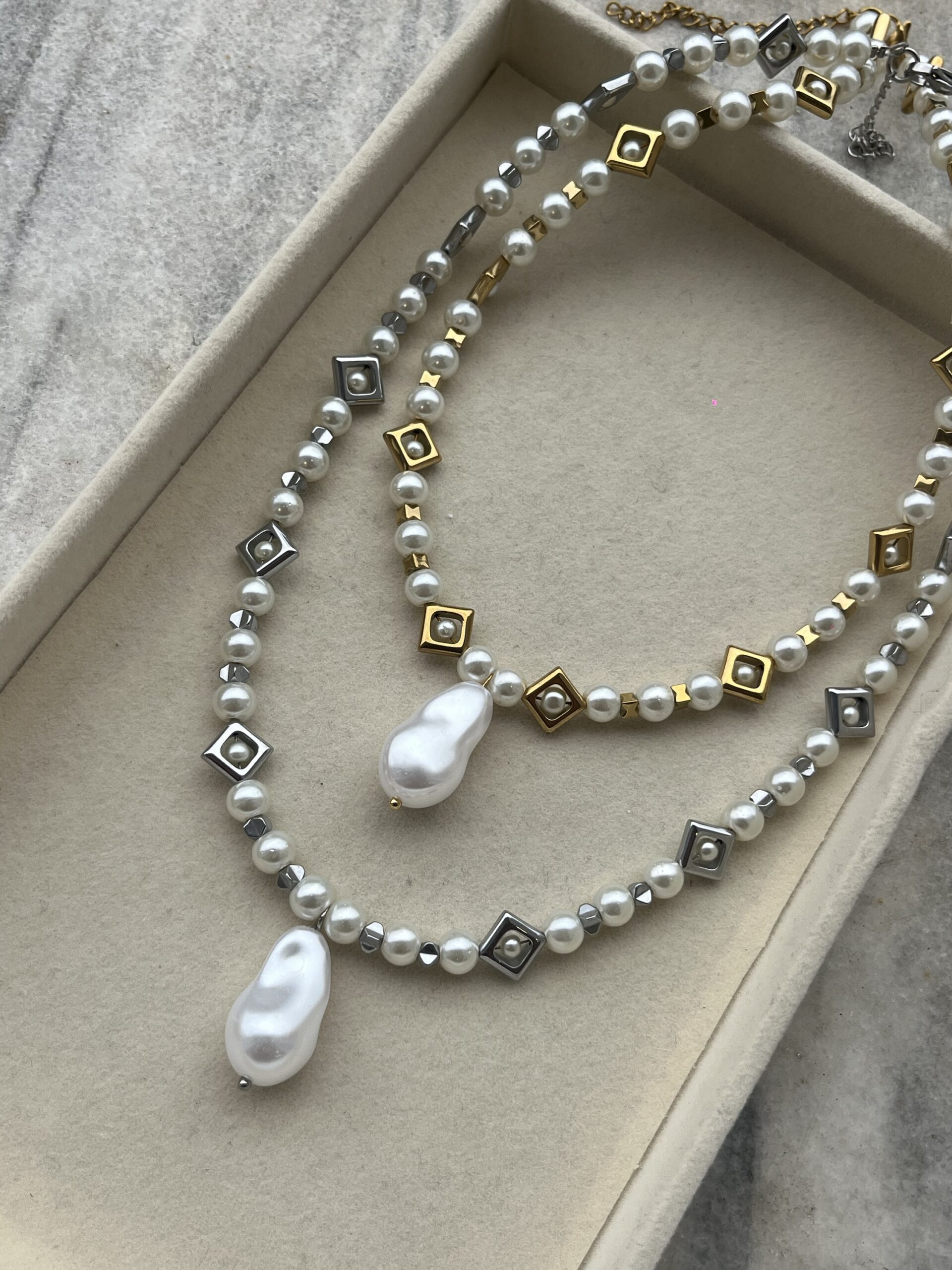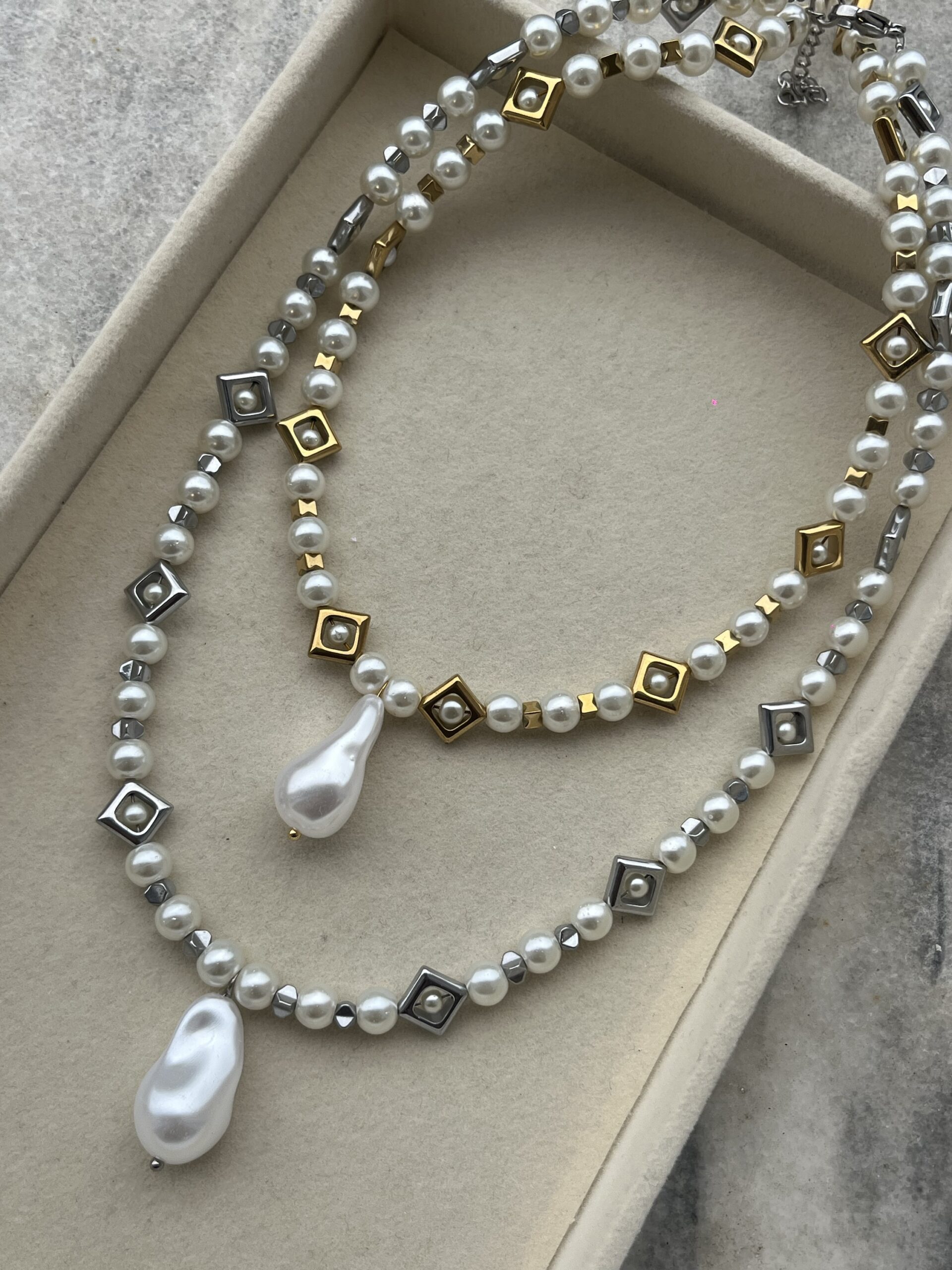 Ατσάλινο 100% χειροποίητο κολιέ με ακρυλικές πέρλες και χάντρες αιματίτη.