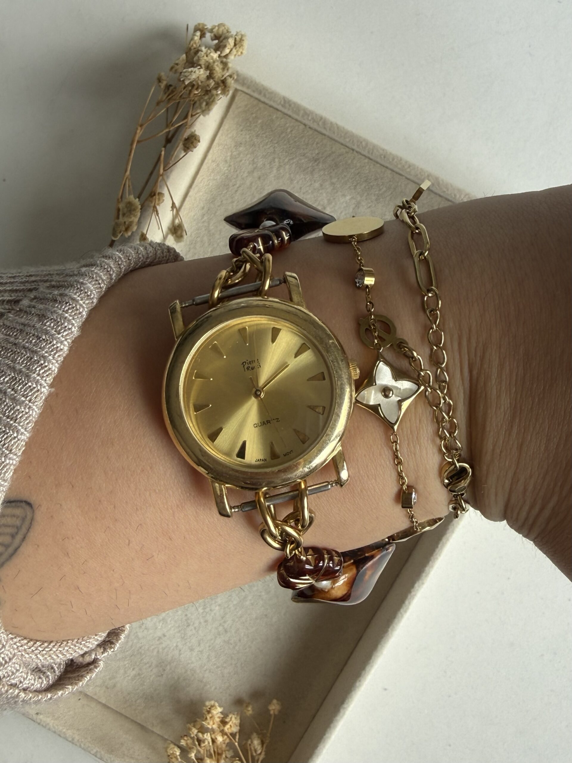 100% χειροποίητο ρολόι/κοσμημα. Φτιαγμένο από άλλο παλιό ρολόι. Λειτουργεί. Φτιαγμένο με ατσάλινη αλυσίδα και χάντρες. Ατσάλινο πίσω μέρος. Μέγεθος: 21,5 εκατοστά. Μπορεί να προστεθεί αλυσίδα επιμήκυνσης αν ζητηθεί.