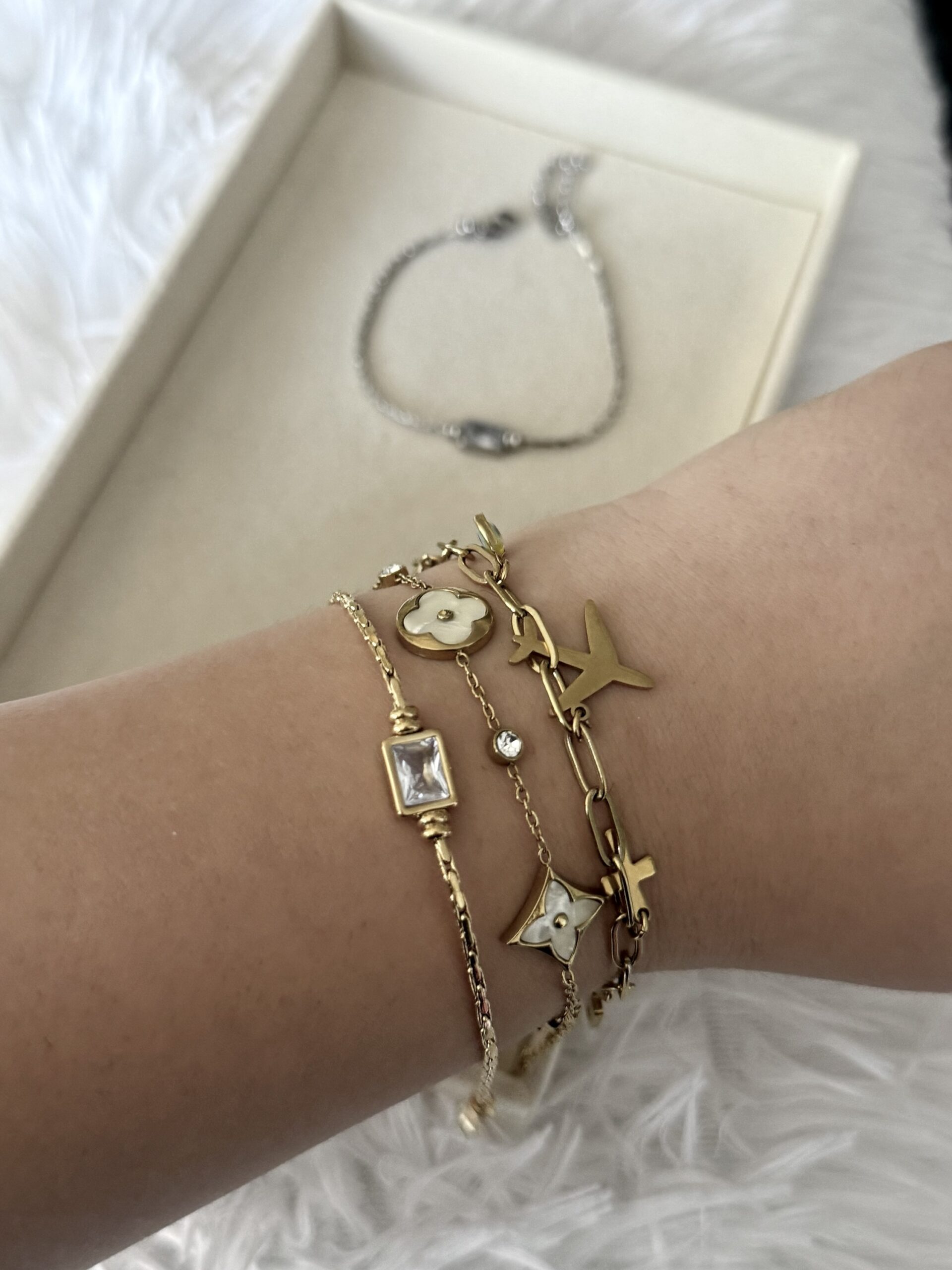 Ατσάλινο βραχιόλι με ιδιαίτερη αλυσίδα και διαμαντάκι στη μέση. Μέγεθος: 17 εκατοστά με 5 εκατοστά επιμήκυνση.
