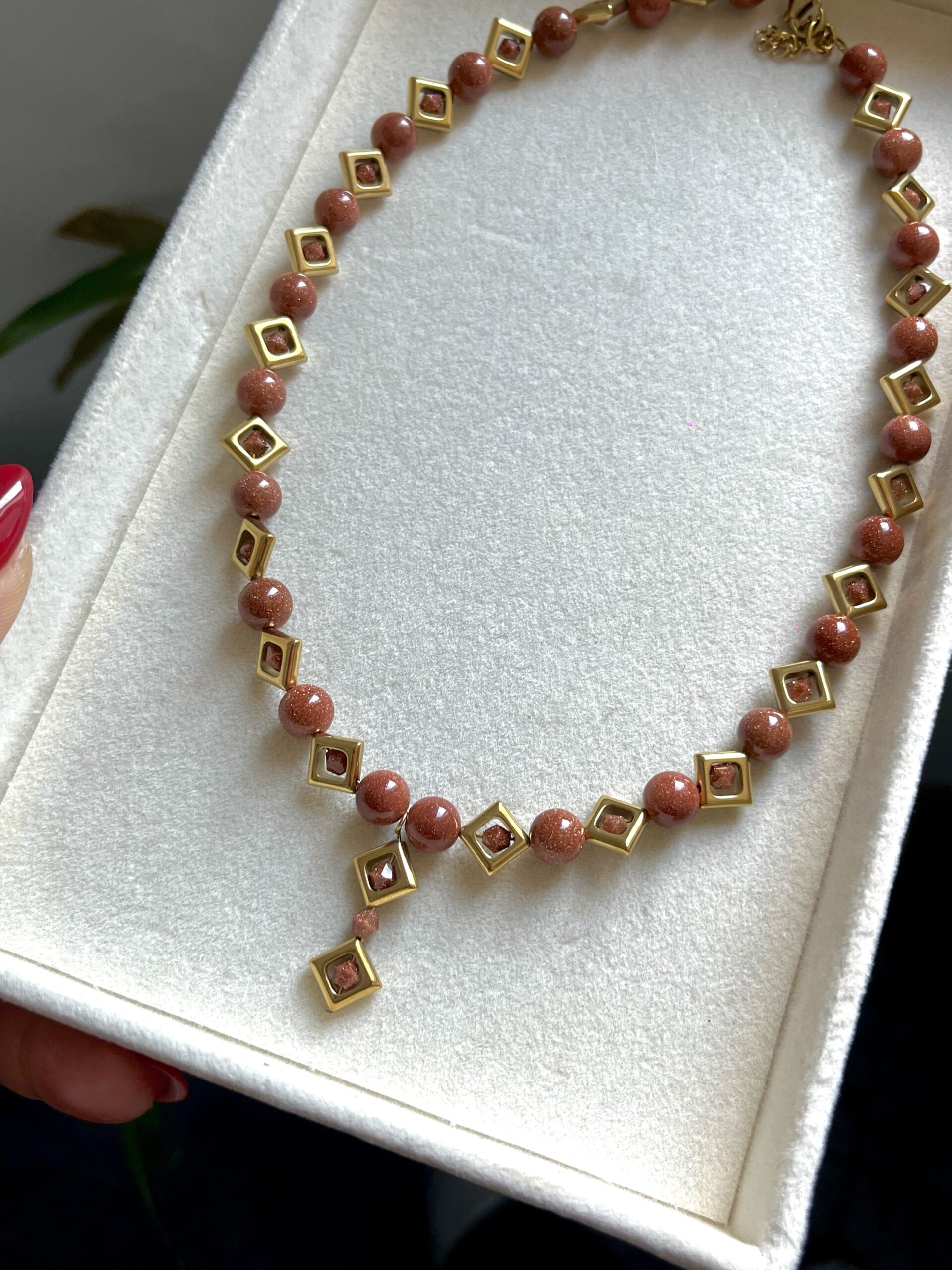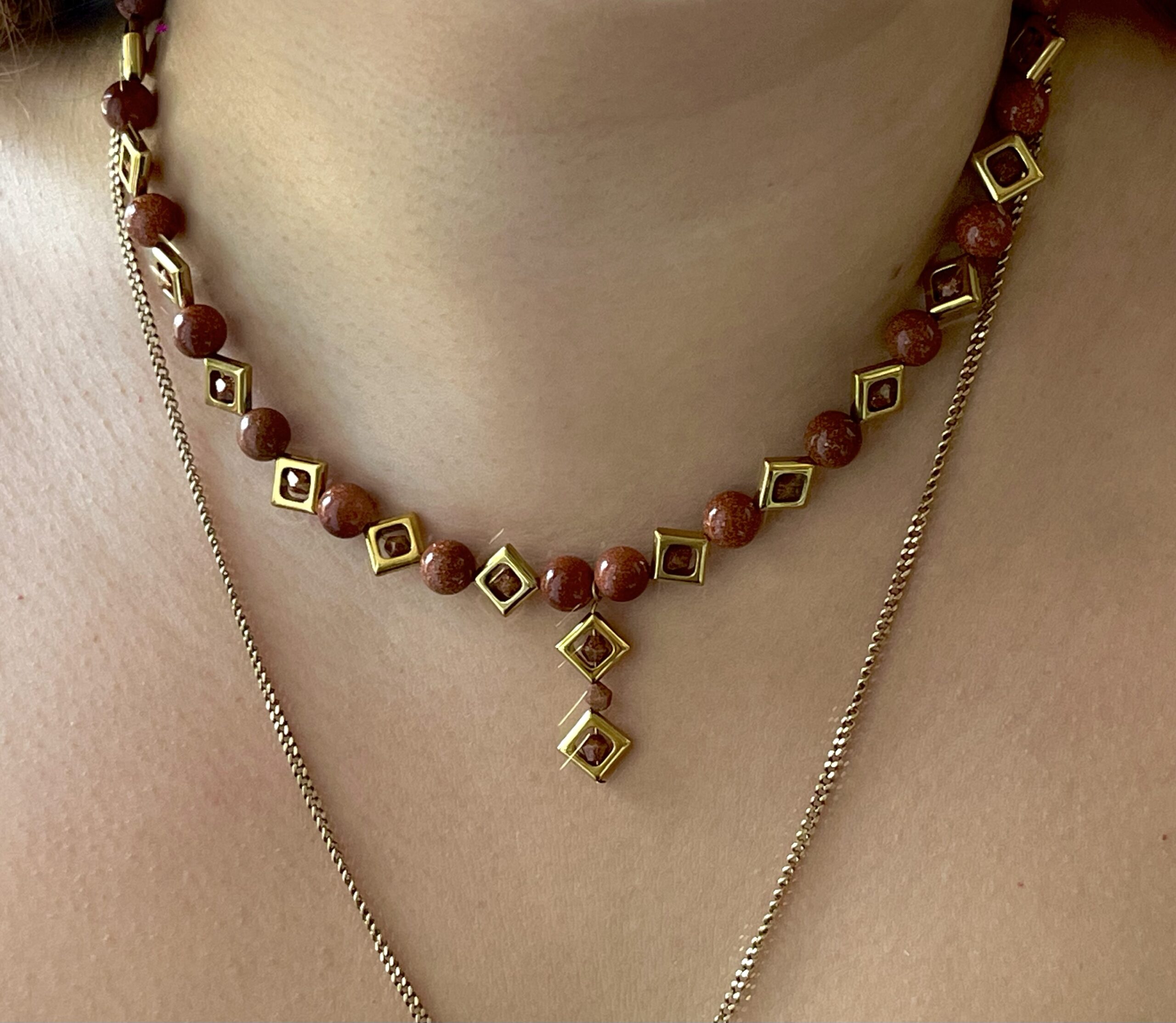 Ατσάλινο 100% χειροποίητο κολιέ με χάντρες αιματίτη και καφέ χρυσολιθου.
