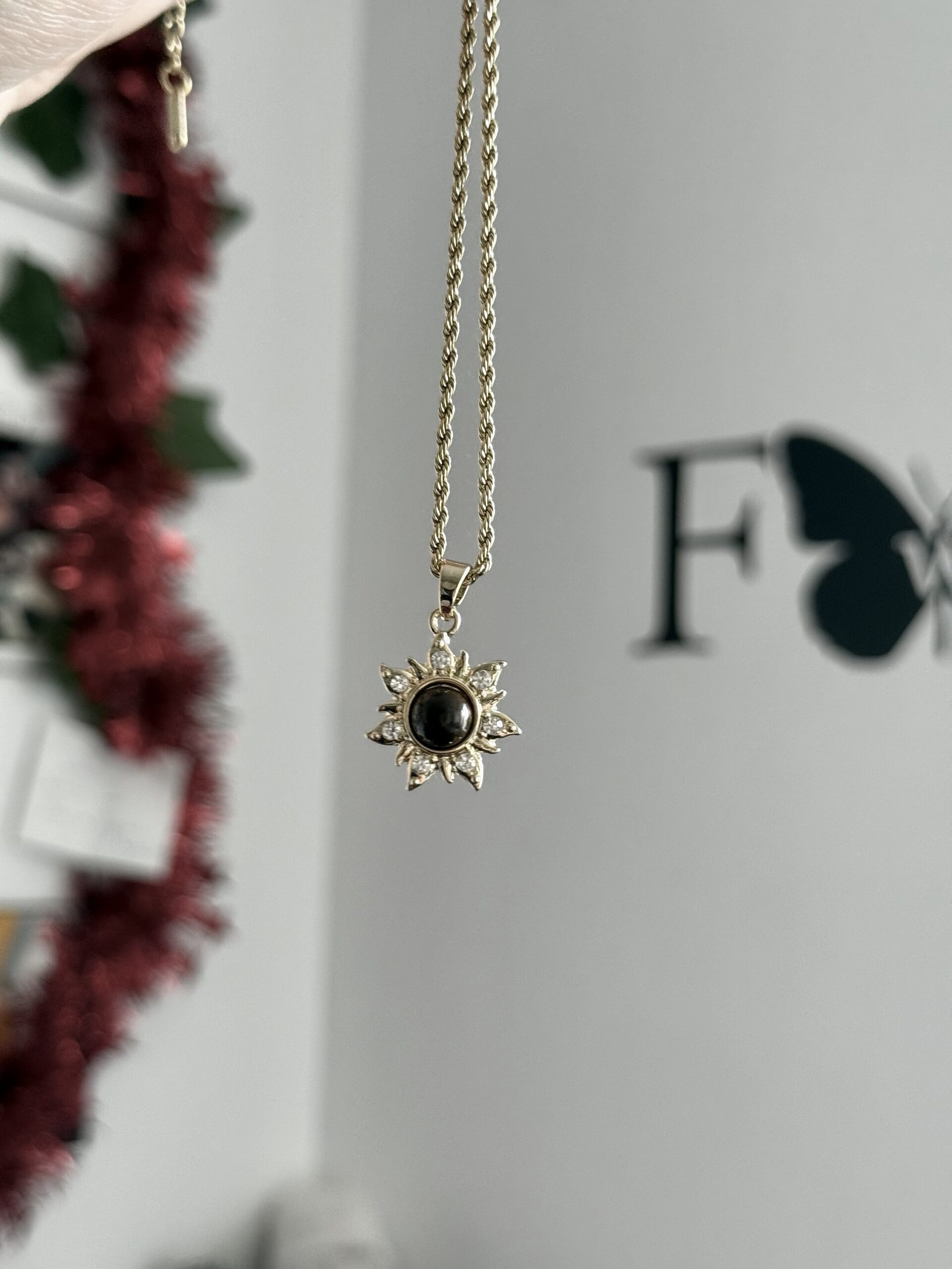 Ατσάλινο κολιέ με κρεμαστό μάτι τίγρης σε ήλιο και στριφτή αλυσίδα.