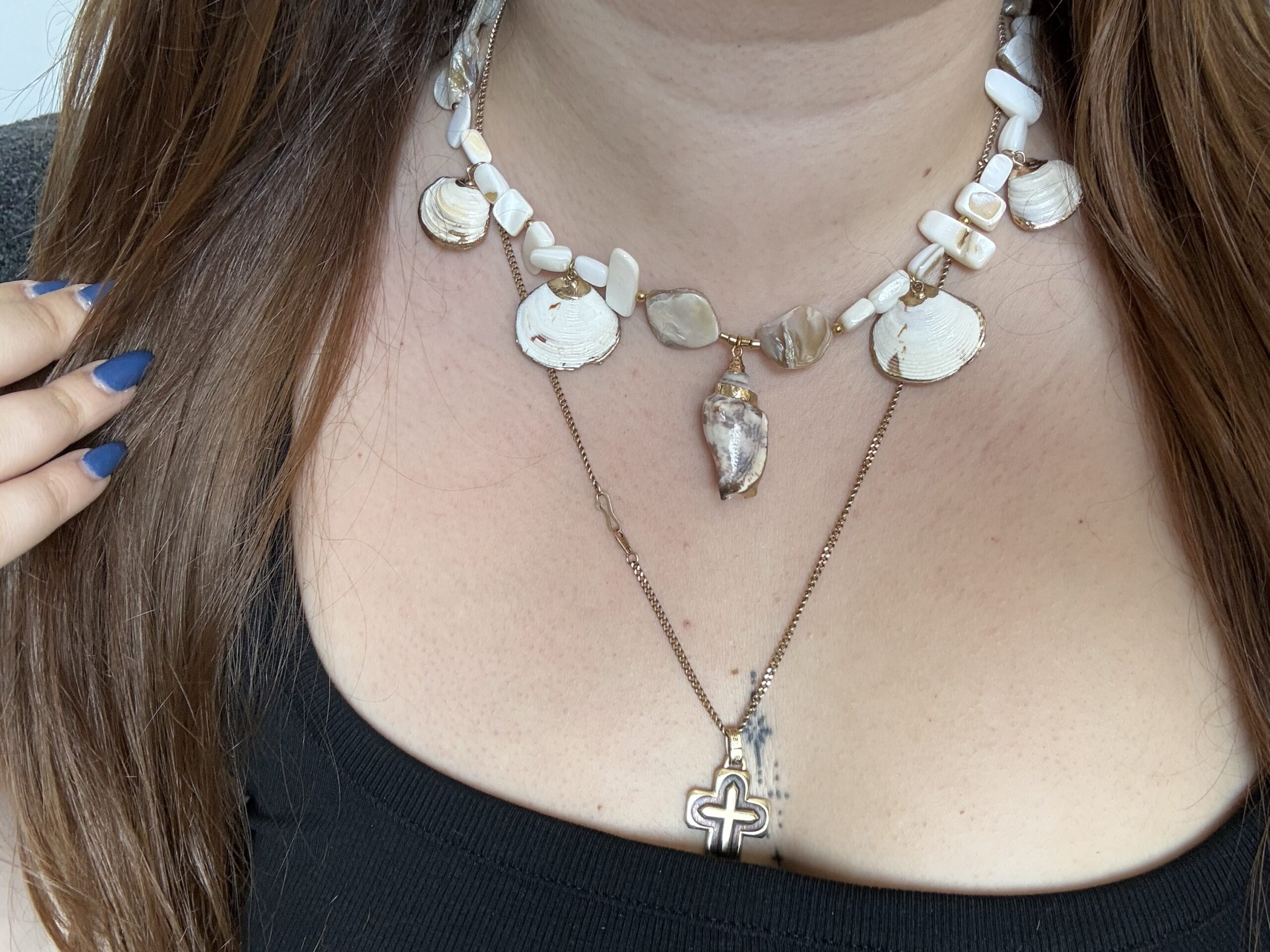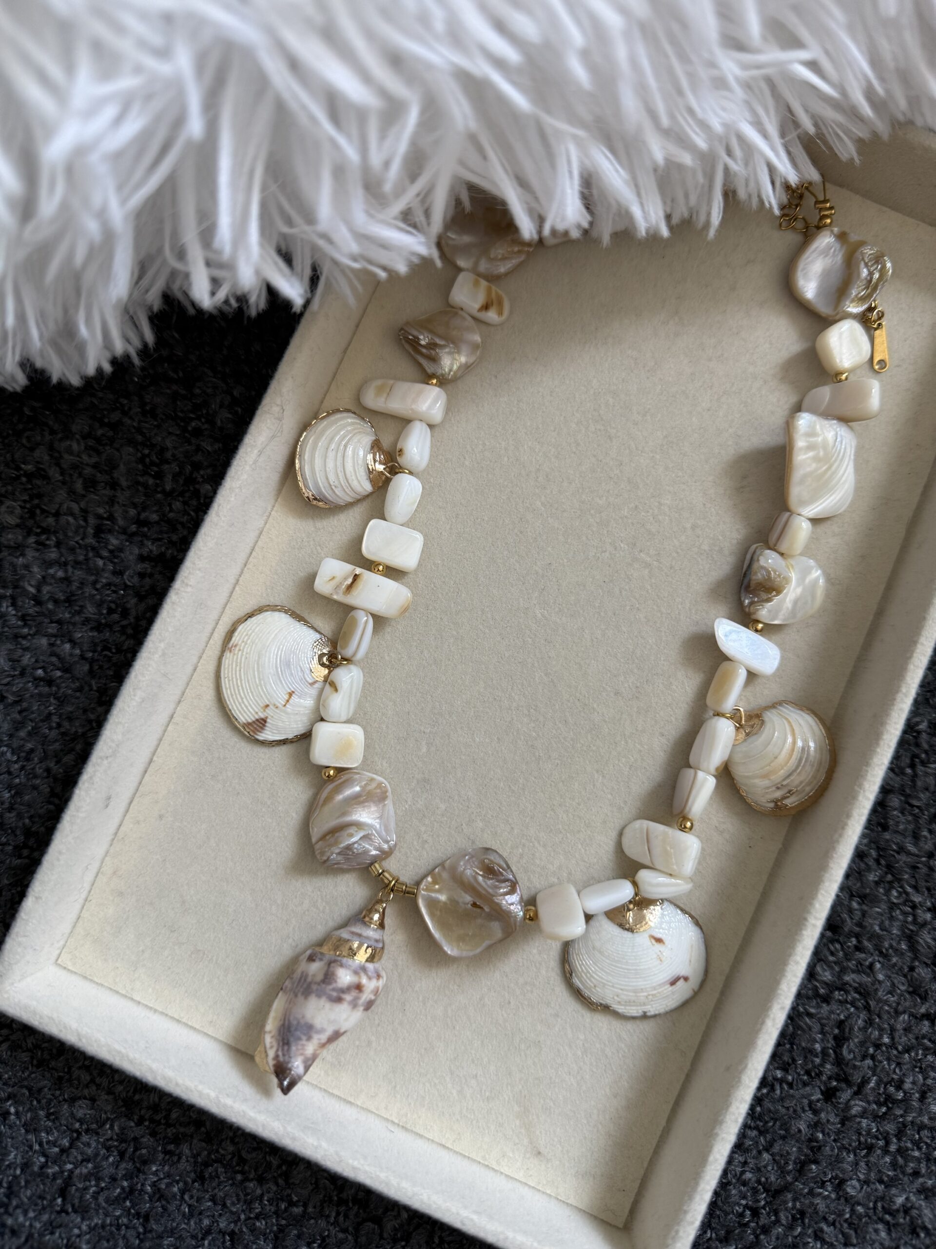 Ατσάλινο 100% χειροποίητο κολιέ με χάντρες φίλντισι και κρεμαστά κοχύλια από ορείχαλκο.